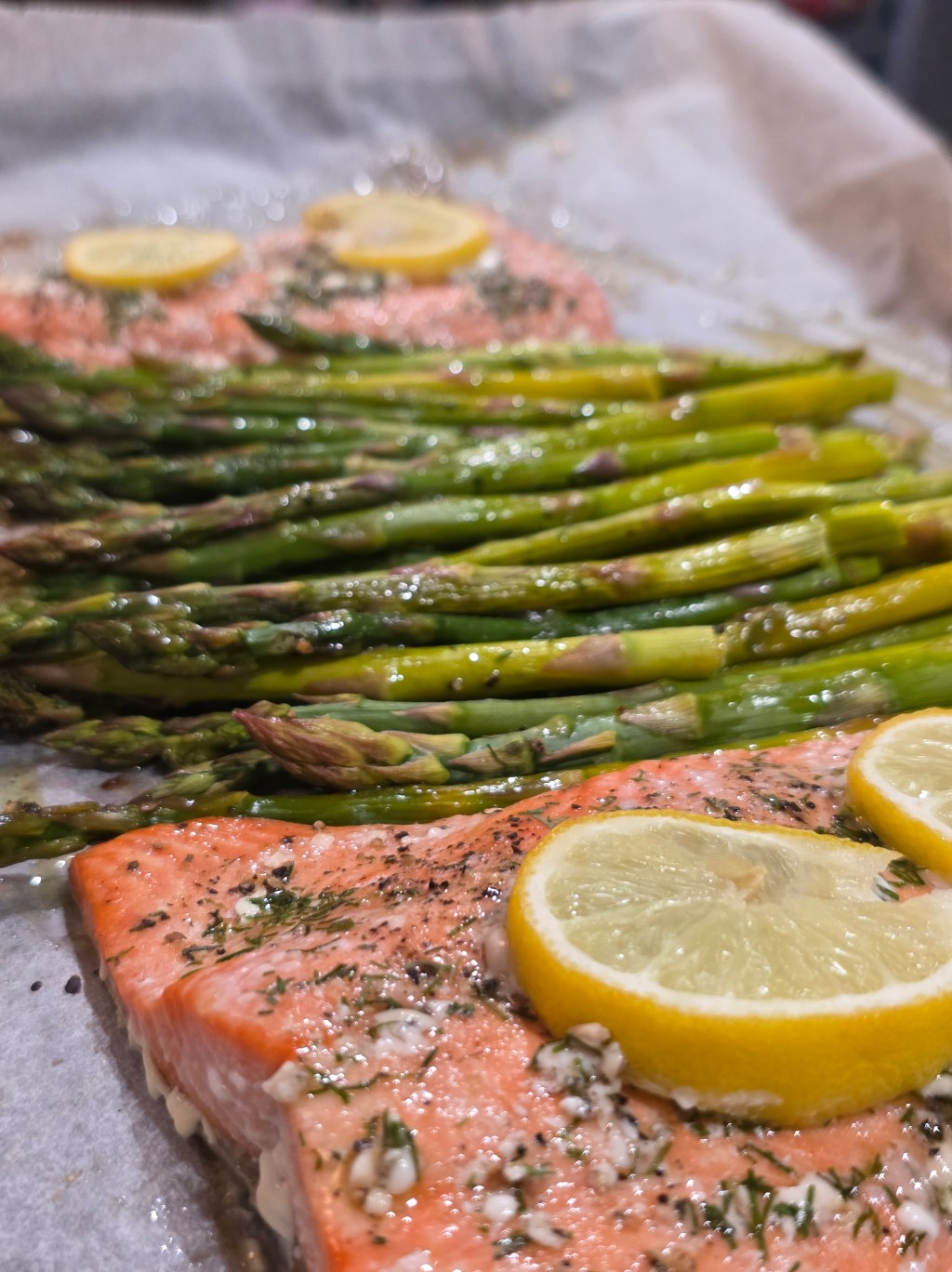 - Place salmon and asparagus on the pan. Drizzle both with extra virgin olive oil and the juice of half a lemon.